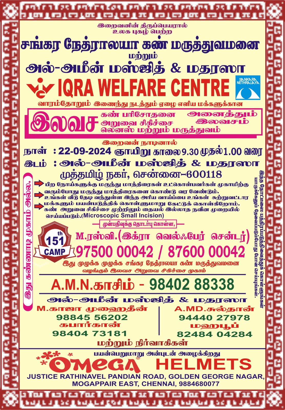 அஸ்ஸலாமு அலைக்கும் அன்பார்ந்த சகோதரர்களே வருகின்ற 22- 9-24 ஞாயிற்றுக்கிழமை 151 வது இலவச கண் அறுவை சிகிச்சை முகாம் நடைபெறுகிறது. இந்த கண் அறுவை சிகிச்சை…