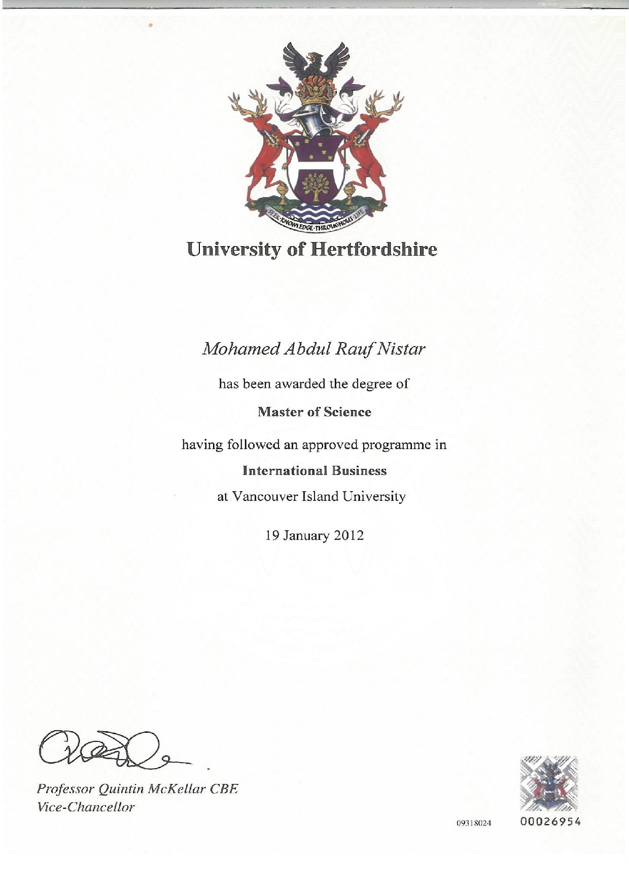 மேலும் தற்போது இலண்டனின் ஹெர்ட் ஃபோர்ட் ஷையர் பல்கலைக்கழகத்தில் மாஸ்டர் ஆஃப் இண்டர்னேஷன்ல் பிசினஸ் என்ற பட்டத்தைப் பெற்றுள்ளார்.