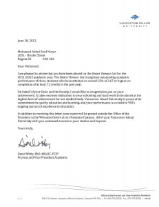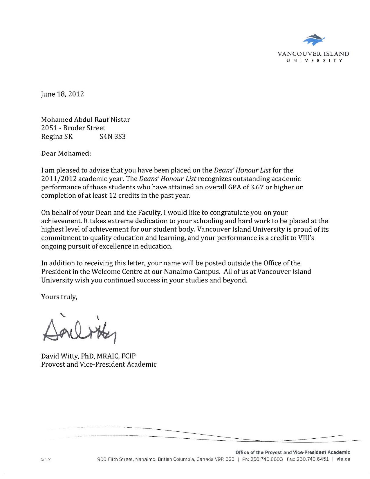 மேலும் கனடாவின் வான்கூவர் ஐலாண்ட் பல்கலைக்கழகத்தின் டீனின் பாராட்டுப் பட்டியலிலும் இடம் பெற்றுள்ளார் முஹம்மது அப்துல் ரவூஃப் நிஸ்தர். கல்வியில் சிறந்து விளங்கியமைக்காக இந்த பாராட்டு கிடைத்துள்ளது.