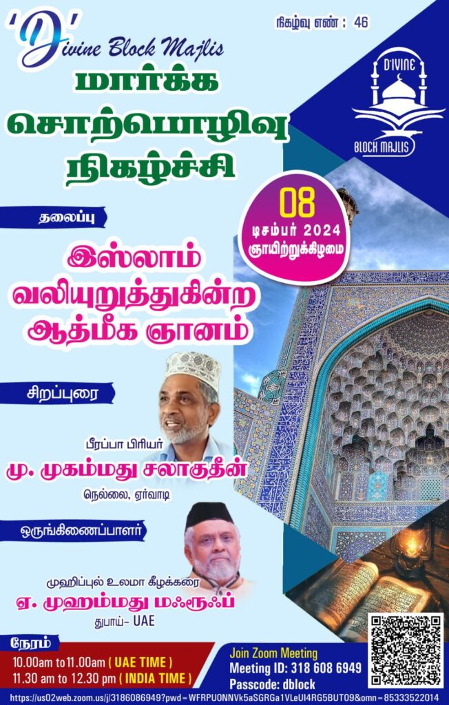 துபாய் டிவைன் பிளாக் மஜ்லிசில் 08.12.2024 ஞாயிற்றுக்கிழமையன்று சிறப்பு மார்க்க சொற்பொழிவு நிகழ்ச்சி இணைய வழியாக நடக்க இருகிறது.