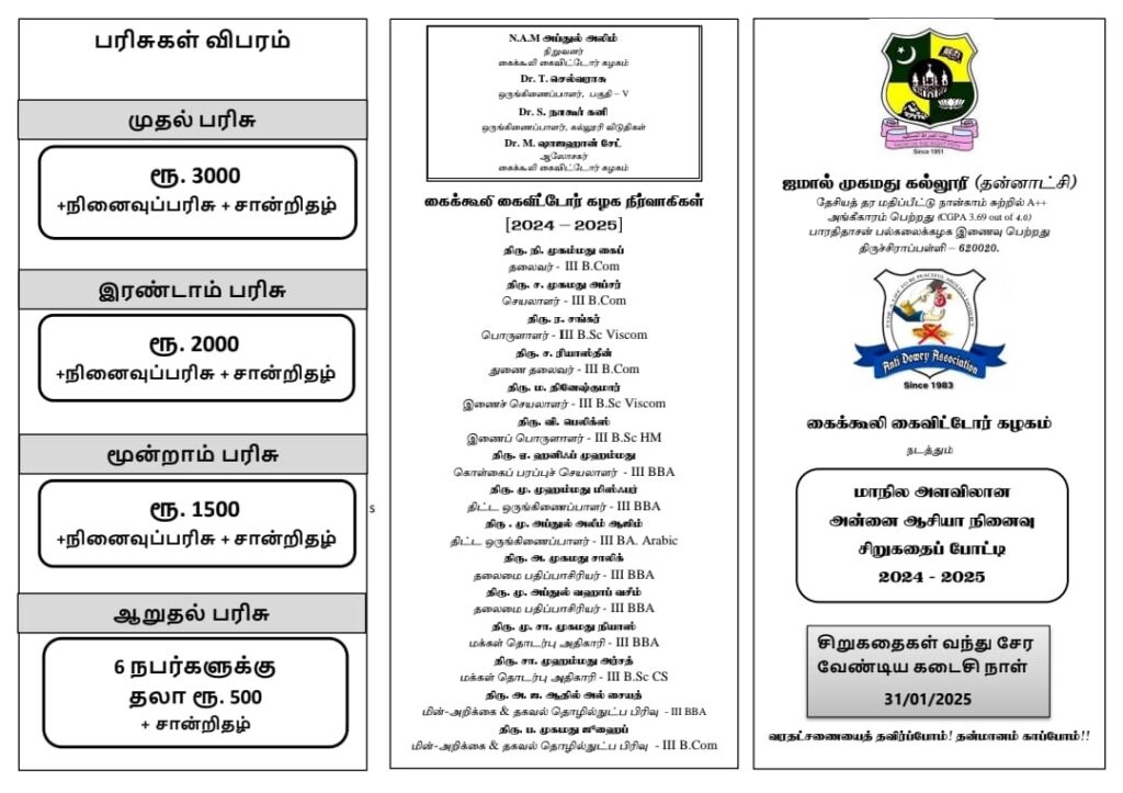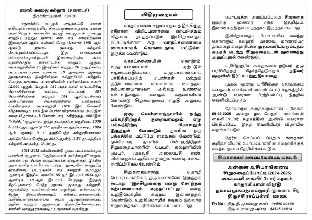 Home/General News/அன்னை ஆசியா நினைவு சிறுகதைப் போட்டி General News அன்னை ஆசியா நினைவு சிறுகதைப் போட்டி முதுகுளத்தூர்December 21, 20240 103 Less than a minute Post Views: 203 Tagsஅன்னை ஆசியா நினைவு சிறுகதைப் போட்டி முதுகுளத்தூர்December 21, 20240 103 Less than a minute Facebook X LinkedIn Tumblr Pinterest Reddit VKontakte Share via Email Print