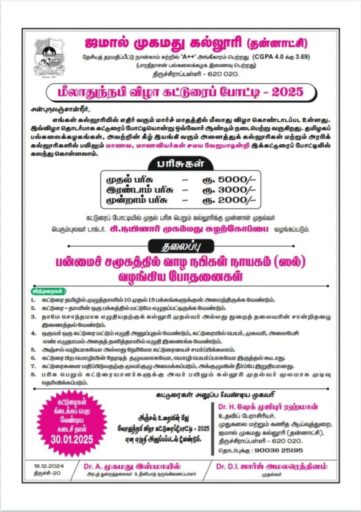 Home/General News/திருச்சி ஜமால் முகமது கல்லூரி நடத்தும் மீலாதுந்நபி விழா கட்டுரைப் போட்டி 2025 General News திருச்சி ஜமால் முகமது கல்லூரி நடத்தும் மீலாதுந்நபி விழா கட்டுரைப் போட்டி 2025 முதுகுளத்தூர்December 27, 20240 119 Less than a minute Post Views: 527 Tags2025 கட்டுரைப் போட்டி திருச்சி நடத்தும் மீலாதுந்நபி விழா ஜமால் முகமது கல்லூரி முதுகுளத்தூர்December 27, 20240 119 Less than a minute Facebook X LinkedIn Tumblr Pinterest Reddit VKontakte Share via Email Print
