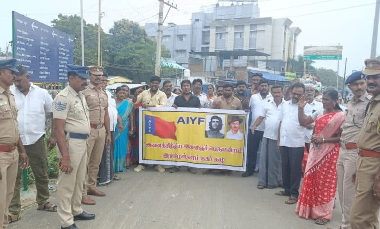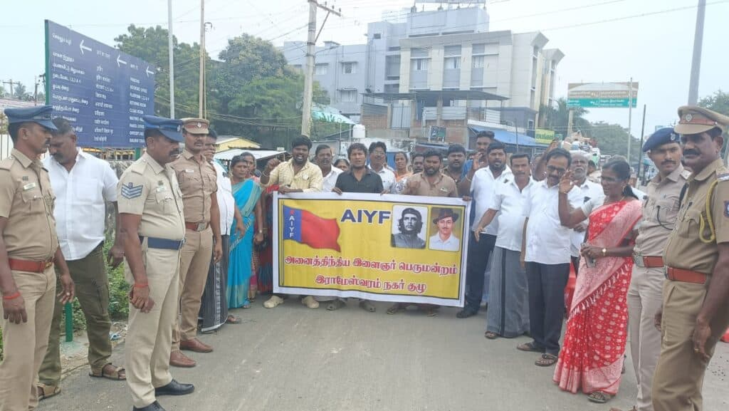 பாம்பன் புதிய ரயில் பாலத்தை திறக்க வலியுறுத்தி அனைத்திந்திய இளைஞர் பெருமன்றம் AIYF சார்பில் கண்டன ஆர்ப்பாட்டம்