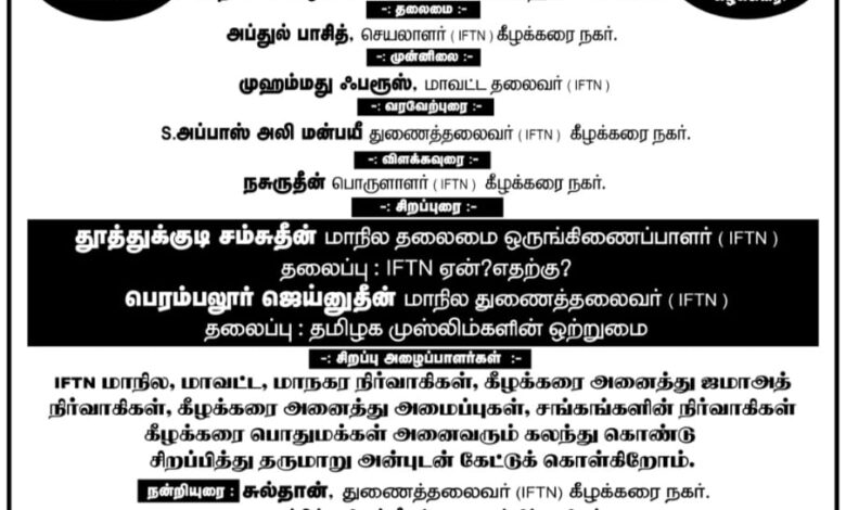 தமிழ்நாடு இஸ்லாமிய கூட்டமைப்பு (IFTN) கீழக்கரை நகர் நடத்தும்