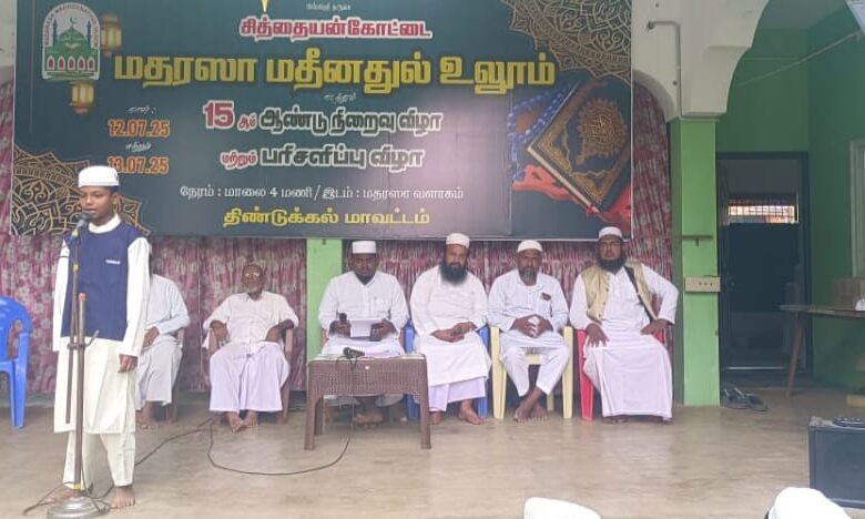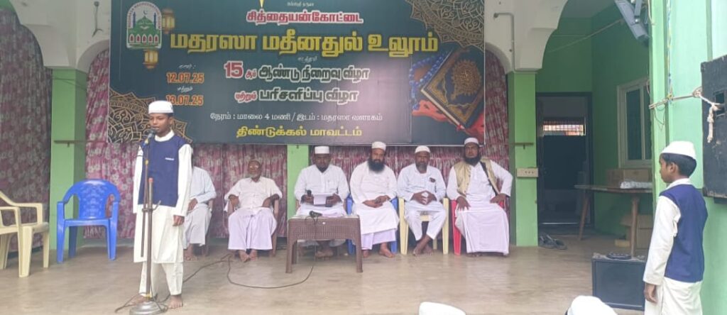 சித்தையன் கோட்டை மதரஸா மதீனதுல் உலூம் ஹிப்ழு,நிஸ்வான் மற்றும் மக்தப் மதரஸாவின் 15 ஆம் ஆண்டு நிறைவு விழா 13.07.2025 ஞாயிற்றுக்கிழமை மிகச் சிறப்பாக நடைபெற்றது