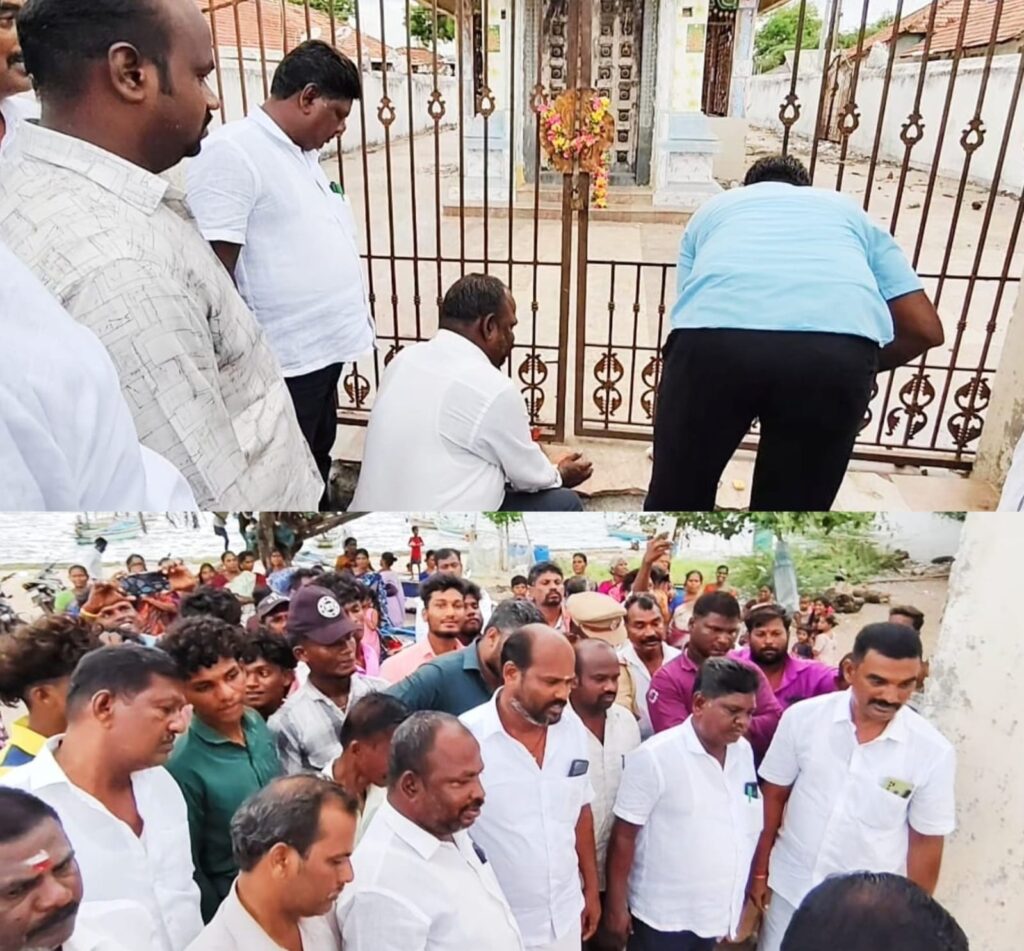 ராமநாதபுரம் மாவட்டம் தொண்டி புதுக்குடி கடற்கரை ஓரத்தில் அமைந்துள்ள சந்தன மாரியம்மன் கோவில் எட்டு ஆண்டுகளாக பூட்டி இருந்த நிலையில் அதிகாரிகள் சமரச பேச்சு வார்த்தைக்கு பின் ஊர் பொதுமக்கள் முன்னிலையில் திருவாடானை வட்டாட்சியர் தலைமையில் மற்றும் தொண்டி.RI. VAO. காவல்துறை அதிகாரிகள் ஆகியோர்கள் முன்னிலையில் திறந்து வைக்கப்பட்டது
