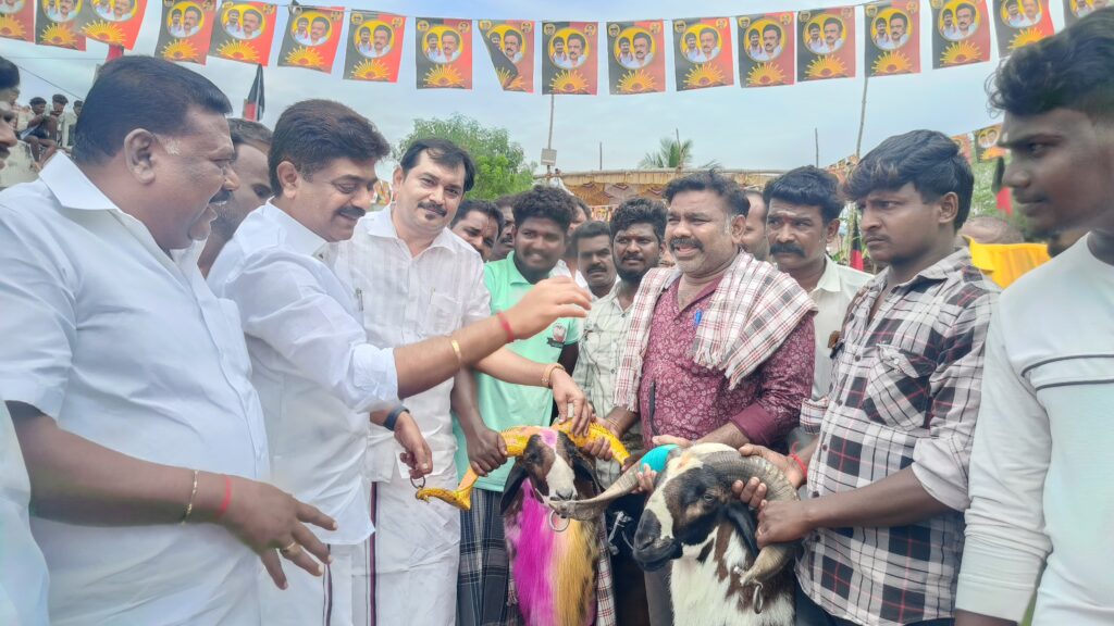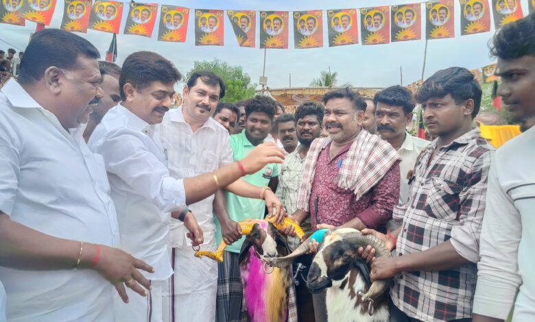 அபிராமத்தில் கலைஞர் 102 வது பிறந்த நாள் விழாவை முன்னிட்டு திமுக அபிராமம் பேரூர் கழகம் சார்பில் கிடாமுட்டு போட்டி 60 ஆட்டு கிடாய்கள் பங்கேற்பு