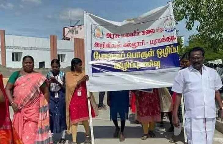 இராமநாதபுரம் மாவட்டம், பரமக்குடி அரசு மகளிர் கலை மற்றும் அறிவியல் கல்லூரி சார்பாக போதைப் பொருள் ஒழிப்பு குறித்த விழிப்புணர்வு பேரணி நடைபெற்றது. இதில், பரமக்குடி சட்டமன்ற உறுப்பினர், முருகேசன். மற்றும் கல்லூரி ஆசிரியர்கள், மாணவ, மாணவிகள் ஏராளமானோர் கலந்துகொண்டு நகர் வீதிகளில் பேரணியாக சென்றனர். பேரணியின் போது போதை பொருள்களுக்கு எதிராக கோஷங்கள் எழுப்பப்பட்டது.