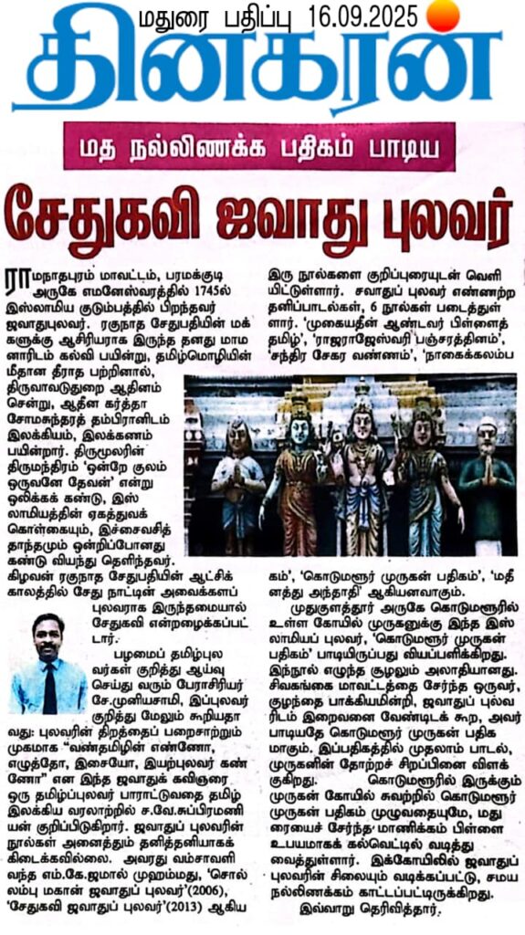 கொடுமளூர் முருகன் கோவிலில் இசுலாமியப் புலவரான ஜவாதுப் புலவரின் சிலை அமைக்கப்பட்டுள்ளது எனும் செய்தி இங்கே கவனிக்கத்தக்கது. முதலாவது, ஒரு இசுலாமியப் புலவர் முருகக் கடவுள் மீது பதிகம் பாடிய செயல் போற்றத்தக்கது. இரண்டாவது முருகக் கடவுள் மீது இசுலாமியப் புலவர் பதிகம் ஒன்று பாடிவிட்டார் என்பதை அறிந்து அக்கோவிலில் அவரது சிலை வடித்திருப்பது வரவேற்கத்தக்கது. இதன் மூலம் மதம் எனும் நிலையைக் கடந்து சமய நல்லிணக்கத்தோடு இவர்கள் செயல்பட்டுள்ளனர் என்பதை அறியும்போது இந்து மற்றும் இஸ்லாமியர்களுக்கிடையே உள்ள சகோதரத்துவத்தையும், மத நல்லிணக்கத்திற்குச் சிறந்த சான்றாகவும் இந்நிகழ்வு அமைதுள்ளமை கவனிக்கத்தக்கது.