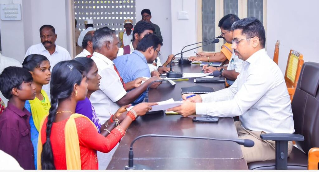ராமநாதபுரம் ஆட்சியர் அலுவலக கூட்டரங்கில் மாவட்ட ஆட்சித் தலைவர் சிம்ரன் ஜுத் சிங் காலோன் மக்கள் குறைதீர்க்கும் நாள் கூட்டத்தில் பொது மக்களிடம் மனுக்களை பெற்று குறைகளை கேட்ட றிந்தார் உடன் மாவட்ட வருவாய் அலுவலர் கோவிந்தராஜலு உள்ளார்.