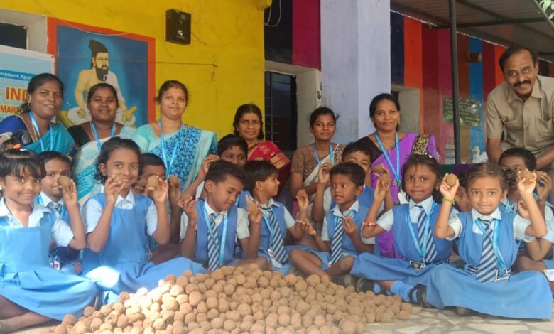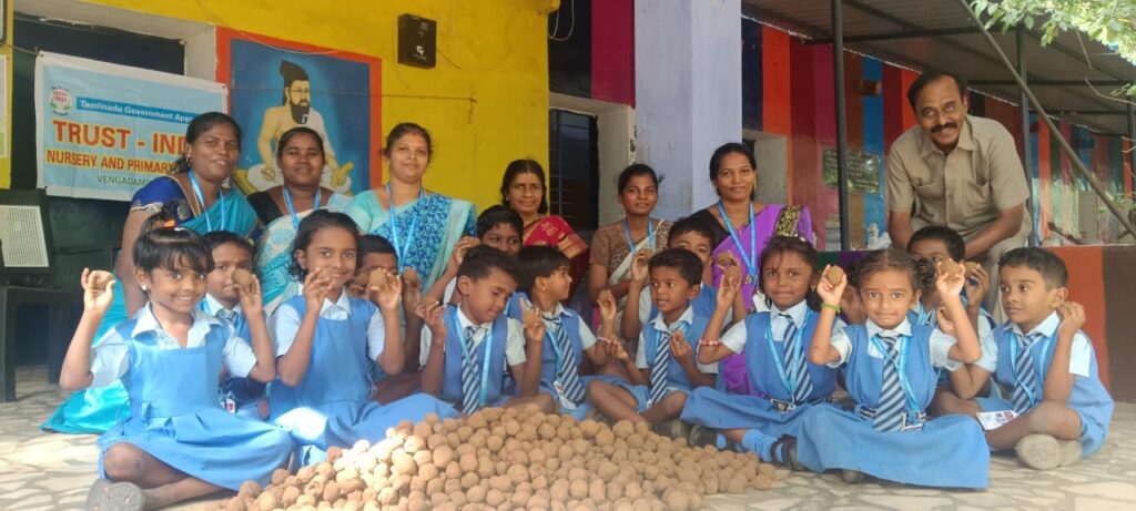 மெட்ரிக், சிபிஎஸ்இ, தனியார், அரசு, அரசு உதவி பெறும், ஆர்.சி, சிஎஸ்ஐ, தொடக்கப்பள்ளி, உயர்நிலைப்பள்ளி, மேல்நிலைப்பள்ளி, நர்சரி பள்ளிகள் என விதைப்பந்துகள் தயாரிப்பு ஒரு கோடியை நோக்கி வேகமாக நகர்ந்து வருகிறது. தென்காசி மாவட்டம், வெங்காடம்பட்டி டிரஸ்ட்- இந்தியா பள்ளி இந்த விதைப்பந்து புரட்சியில் பங்கெடுத்துள்ளது. அங்கு படிக்கும் சிறு பிள்ளைகள் ஆர்வமாக ஆயிரக்கணக்கில் விதைப்பந்துகளை செய்து குளக்கரை, ஓடை, சாலையோரம், தனியார் தரிசு நிலப்பகுதி என இந்த தீபாவளி பண்டிகையை முன்னிட்டு இயற்கைக்கு அர்ப்பணித்துள்ளனர். தலைமை ஆசிரியை சாந்தி ஆசிரியைகள் மாரிச்செல்வம், சாந்தி, காளியம்மாள், முத்துச்செல்வி, பவித்ரா குழந்தைகளை பள்ளியில் இருந்து அழைத்துச் சென்று விதைப்பந்துகளை பத்திரமாக வீசினர். இதில் ஈடுபட்ட குழந்தைகளுக்கு சமூக நல ஆர்வலரும் டிரஸ்ட்- இந்தியா பள்ளி தாளாளருமான வெங்காடம்பட்டி பூ. திருமாறன் சான்றிதழ்கள் வழங்கி வாழ்த்தினார்.