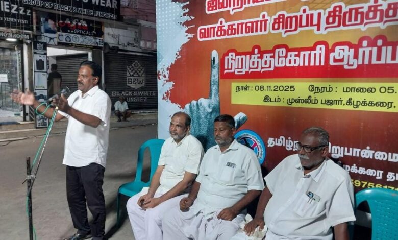 ராமநாதபுரம் மாவட்டம் கீழக்கரை முஸ்லிம் பஜாரில் தமிழ்நாடு சிறுபான்மை மக்கள் நலக்குழு சார்பாக ஜனநாயக படுகொலை செய்யும் வாக்காளர் சிறப்பு திருத்தத்தை நிறுத்த கோரி கண்டன ஆர்ப்பாட்டம் நடைபெற்றது