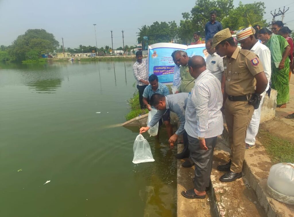 ராமநாதபுரம் மாவட்டம் ராமநாதபுரம் ஊராட்சி ஒன்றியம் சூரக்கோட்டை ஊராட்சி இடையார் வலசைகிராமத்தில் மாவட்ட ஆட்சித் தலைவர் சிம்ரன் ஜீத் சிங் காலோன்மீன் வளம் மற்றும் மீனவர் நலத்துறை மூலம் மீன் உற்பத்தி திட்டத்தை துவக்கி வைத்தார். உடன் மீன்வளத்துறை இணை இயக்குனர் வேல்முருகன் உள்ளார்.