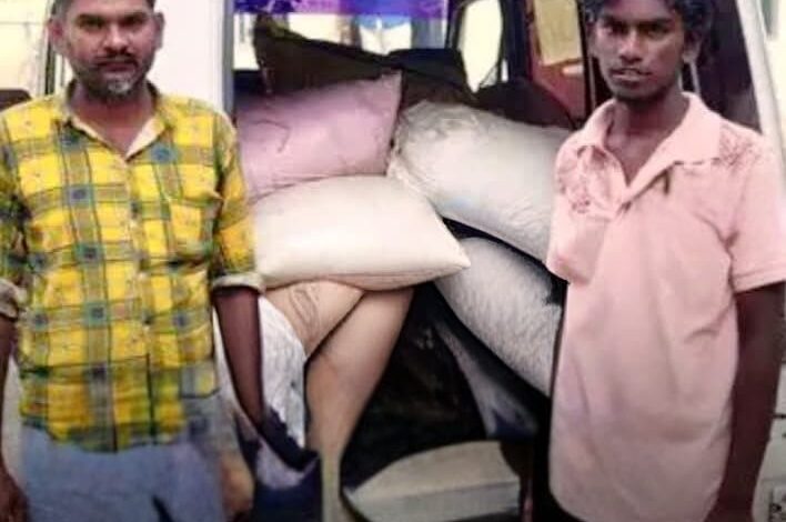 ராமநாதபுரம் மாவட்டம் திருவாடனை அருகே கல்லூரில் சரக்கு வாகனத்தில் கடத்தப்பட்ட 1400 கிலோ ரேஷன் அரிசியை ராமநாதபுரம் உணவுப்பொருள் கடத்தல் பிரிவு எஸ். ஐ. அருண் தலைமையிலான போலீசார் வாகன சோதனையில் ஈடுபட்டனர். அப்போது அவ்வழியாக வந்த சரக்கு வாகனத்தை சோதனை செய்த போது 28 மூட்டைகளில் 50 கிலோ எடையுள்ள 1400 கிலோ ரேஷன் அரிசியை பறிமுதல் செய்தனர்.இதில் கடலாடியைச் சேர்ந்த காளீஸ்வரன் 35 வயது திருக்காளிமுத்து வயது 22 ஆகியோரை கைது செய்தனர் விசாரணையில் அரிசியை சிவகங்கை மாவட்டம் புதுவயல் போன்ற இடங்களில் உள்ள அரிசி ஆலைகளுக்கு கொண்டு செல்ல இருந்தது தெரிய வந்துள்ளது.