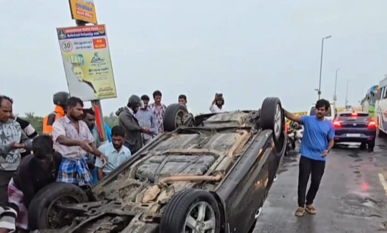 பாம்பன் பாலத்தில் கார் தலைகுப்புற கவிழ்ந்து விபத்து