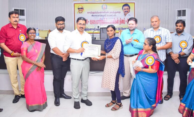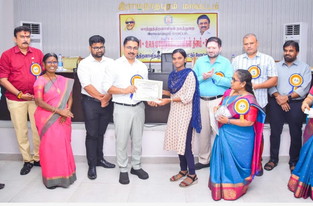 ராமநாதபுரம் மாவட்ட ஆட்சியர் அலுவலகத்தில் உலக நாடுகள் மாற்றுத்திறனாளிகள் தின விழா நிகழ்ச்சியில் மாவட்ட ஆட்சித் தலைவர் சிம்ரன் ஜீத் சிங் கலோன் பல்வேறு போட்டிகளில் பங்கேற்று வெற்றி பெற்ற மாற்றுத் திறன் யுள்ள மாணவ மாணவிகளுக்கு பாராட்டு சான்று மற்றும் நினைவு பரிசு வழங்கி பாராட்டினார். உடன் கூடுதல் ஆட்சியர் (வளர்ச்சி) திவ்யன் ஷீ நிகம் உள்ளார்.