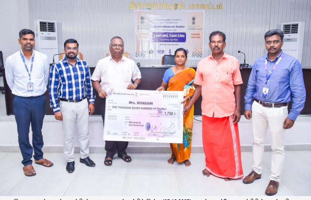 ராமநாதபுரம் மாவட்டம் ஆட்சியர் அலுவலக கூட்டரங்கில் மாவட்ட முன்னோடி வங்கியின் மூலம் உரிமை கோரப்படாத நிதி சொத்துக்கள் மீட்பு முகாமில் பயனாளிகளுக்கு மாவட்ட வருவாய் அலுவலர் சங்கரநாராயணன் நலத்திட்ட உதவிகளை வழங்கினார். உடன் மாவட்ட முன்னோடி வங்கி மேலாளர் கார்த்திகேயன் உள்ளார்.
