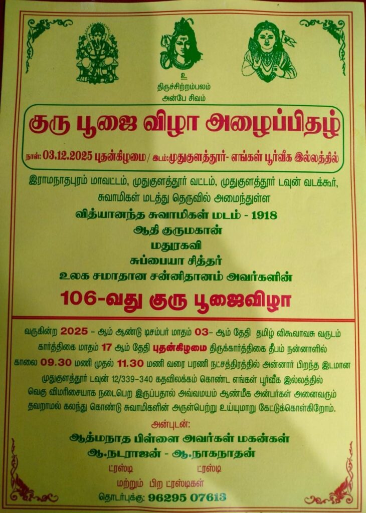 இராமநாதபுரம் மாவட்டம், முதுகுளத்தூர் வடக்கூர் சுவாமிகள் மடத்து தெருவில் அமைந்துள்ள வித்யானந்த சுவாமிகள் மடம் 1918 ஆதிகுருமகான் மதுரகவி சுப்பையா சித்தர் உலக சமாதான சன்னிதானம் அவர்களின் 106 ஆவது குருபூஜை விழா 03.12.2025 அன்று முதுகுளத்தூர் பஜார் தெருவில் அமைந்து உள்ள அவரது பூர்வீக இல்லத்தில் நடைபெற்றது.