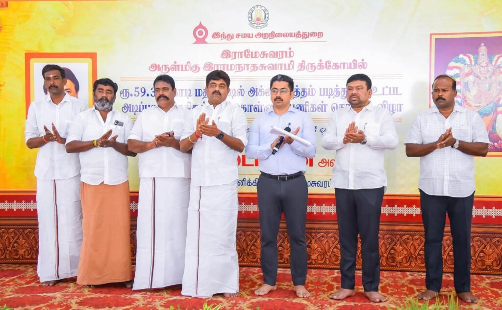 தமிழ்நாடு முதலமைச்சர் அவர்கள் இராமநாதபுரம் மாவட்டம், இராமேஸ்வரம், இராமநாதசுவாமி திருக்கோவிலில் ரூபாய் 59.35 கோடி மதிப்பீட்டில் அக்னி தீர்த்தம் படித்துறை உட்பட அடிப்படை வசதிகள் மேற்கொள்ளும் பணிகளை காணொளிக் காட்சி மூலம் துவங்கி வைத்த நிகழ்வில் இராமநாதபுரம் சட்டமன்ற உறுப்பினரும் திமுக மாவட்ட செயலாளருமான காதர் பாட்சா முத்துராமலிங்கம், இராமநாதபுரம் பாராளுமன்ற உறுப்பினர் நவாஸ் கனி