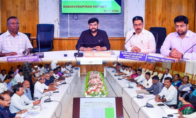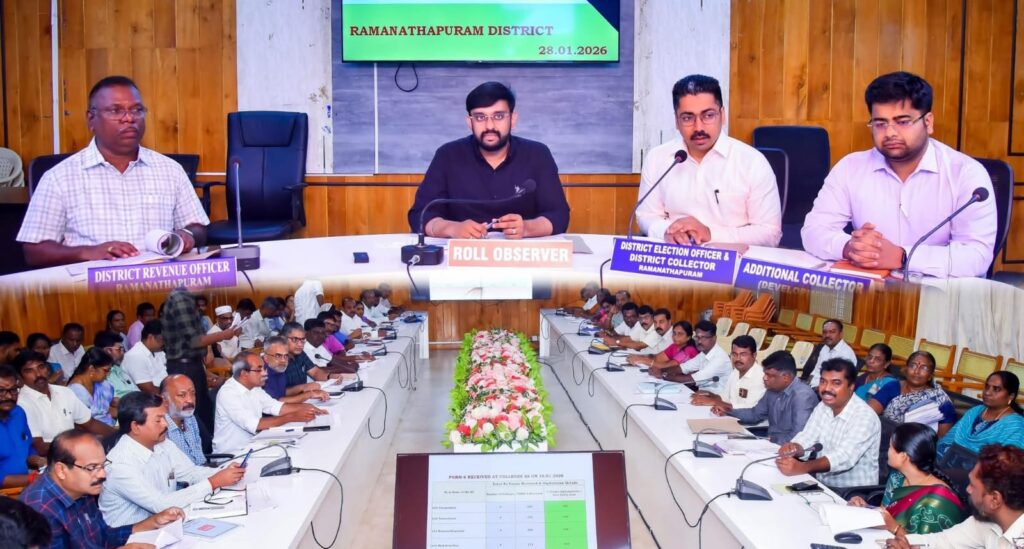 இராமநாதபுரம் மாவட்ட ஆட்சியர் அலுவலக கூட்டரங்கில் இன்று (28.01.2026) வாக்காளர் பட்டியல் பார்வையாளர் சென்னை, தமிழ்நாடு தேசிய சுகாதார இயக்கத்தின் இயக்குநர் ஏ.அருண் தம்புராஜ், தலைமையில், சிறப்புத் தீவிரத் திருத்த வாக்காளர் பட்டியல் தொடர்பாக வாக்காளர் பதிவு அலுவலர்கள்,