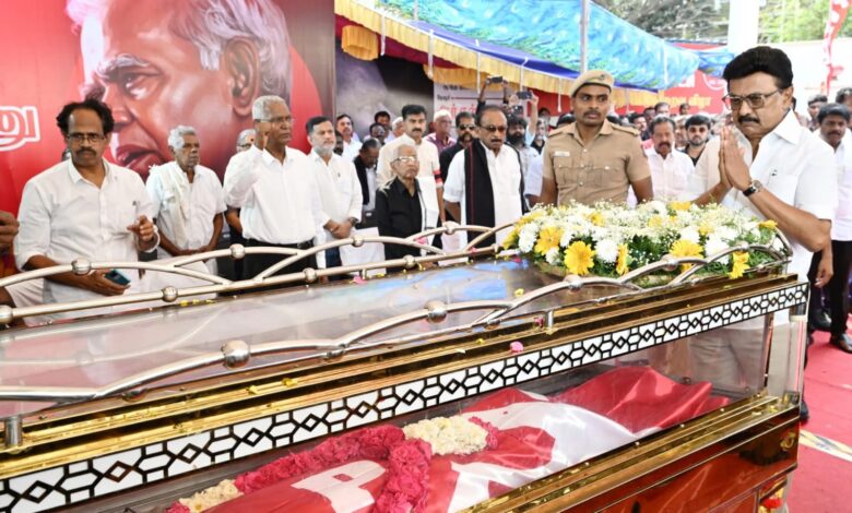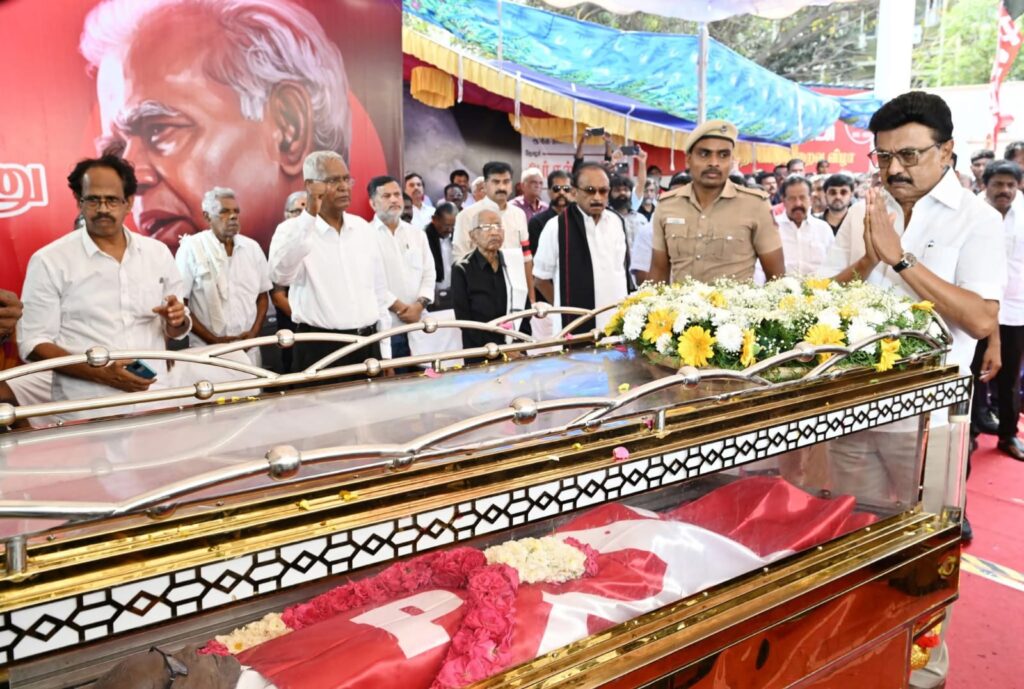 தமிழ்நாடு முதலமைச்சர் மு.க.ஸ்டாலின் அவர்கள் இன்று (26.2.2026) சென்னை, தியாகராய நகரில் உள்ள இந்திய கம்யூனிஸ்ட் கட்சியின் தலைமை அலுவலகமான பாலன் இல்லத்திற்கு நேரில் சென்று இந்திய கம்யூனிஸ்ட் கட்சியின் மூத்த தலைவர் – தகைசால் தமிழர் மறைந்த தோழர் ஆர்.நல்லகண்ணு அவர்களின் உடலுக்கு தமிழ்நாடு அரசின் சார்பில் முழு அரசு மரியாதையுடன் மலர் வளையம் வைத்து இறுதி அஞ்சலி செலுத்தினார். இந்நிகழ்வின்போது, திராவிடர் கழகத் தலைவர் ஆசிரியர் கி.வீரமணி, மாண்புமிகு பொதுப்பணிகள், நெடுஞ்சாலைகள் மற்றும் சிறு துறைமுகங்கள் துறை அமைச்சர் திரு.எ.வ.வேலு, மறுமலர்ச்சி திராவிட முன்னேற்றக் கழகத்தின் பொதுச் செயலாளர் திரு.வைகோ, இந்திய கம்யூனிஸ்ட் கட்சியின் பொதுச் செயலாளர் டி.ராஜா, விடுதலைச் சிறுத்தைகள் கட்சித் தலைவர் தொல்,திருமாவளவன், தமிழ்நாடு காங்கிரஸ் கமிட்டி தலைவரும், சட்டமன்ற உறுப்பினருமான கு.செல்வப்பெருந்தகை, இந்திய கம்யூனிஸ்ட் கட்சியின் மாநில செயலாளர் மு. வீரபாண்டியன், மார்க்சிஸ்ட் கம்யூனிஸ்ட் கட்சியின் மாநிலச் செயலாளர் பெ.சண்முகம், முன்னாள் அமைச்சர் சட்டமன்ற உறுப்பினர் முனைவர் க. பொன்முடி, நாடாளுமன்ற உறுப்பினர் ஆ.ராசா, பெருநகர சென்னை மாநகராட்சி நிலைக்குழு தலைவர் நே.சிற்றரசு, தமிழ்நாடு கொங்கு இளைஞர் பேரவையின் நிறுவனத் தலைவர் தனியரசு, தமிழ்நாடு வணிகர் சங்கங்களின் பேரமைப்பு மாநிலத் தலைவர் ஏ.எம். விக்கிரமராஜா, இந்திய கம்யூனிஸ்ட் மற்றும் மார்க்சிஸ்ட் கம்யூனிஸ்ட் கட்சிகளைச் சார்ந்த நிருவாகிகள் உடனிருந்தனர்.
