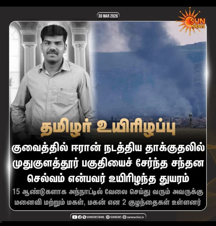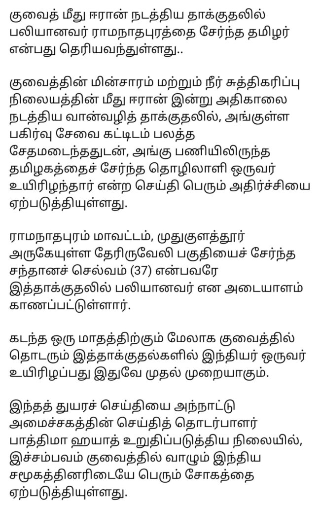 குவைத்தின் மின்சாரம் மற்றும் நீர் சுத்திகரிப்பு நிலையத்தின் மீது இன்று அதிகாலை நடைபெற்ற ஈரான் நடத்திய வான்வழித் தாக்குதலில், பணியிலிருந்த தமிழகத்தைச் சேர்ந்த தொழிலாளி, ராமநாதபுரம் மாவட்டம் முதுகுளத்தூர் அருகேயுள்ள தேரிருவேலி பகுதியைச் சேர்ந்த சந்தானச் செல்வம் (37) அவர்கள் உயிரிழந்த செய்தி மிகுந்த துயரத்தில் ஆழ்த்தியுள்ளது.