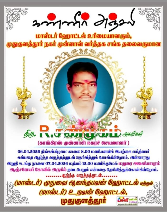 Home/இராமநாதபுரம்/மாஸ்டர் ஹோட்டல் உரிமையாளர் மறைவு இராமநாதபுரம்முதுகுளத்தூர் மாஸ்டர் ஹோட்டல் உரிமையாளர் மறைவு முதுகுளத்தூர்2 weeks ago0 38 Less than a minute Post Views: 51 Tagsஉரிமையாளர் மறைவு மாஸ்டர் ஹோட்டல் முதுகுளத்தூர்2 weeks ago0 38 Less than a minute Facebook X LinkedIn Tumblr Pinterest Reddit VKontakte Share via Email Print