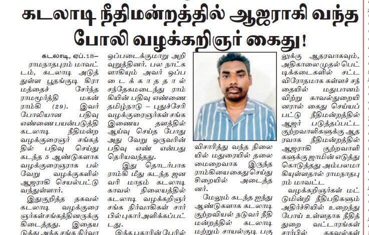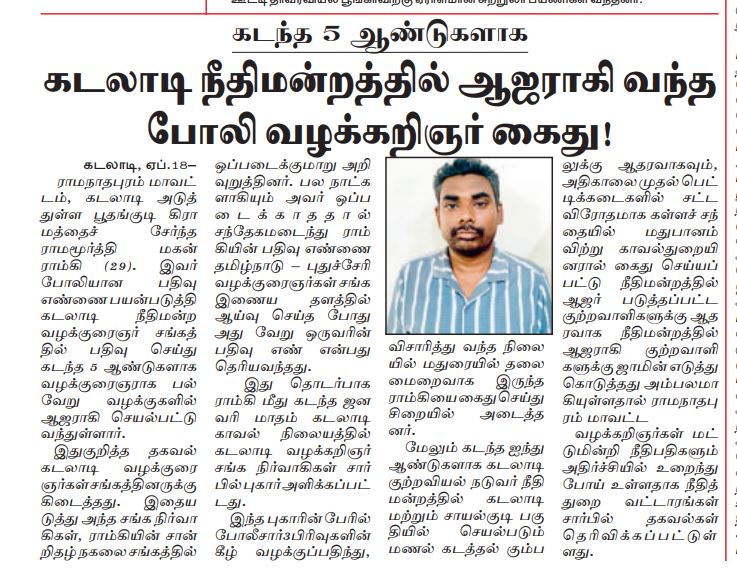 Home/இராமநாதபுரம்/போலி வழக்கறிஞர் கைது ! இராமநாதபுரம்முதுகுளத்தூர் போலி வழக்கறிஞர் கைது ! முதுகுளத்தூர்5 days ago0 19 Less than a minute Post Views: 29 Tagsகைது போலி வழக்கறிஞர் முதுகுளத்தூர்5 days ago0 19 Less than a minute Facebook X LinkedIn Tumblr Pinterest Reddit VKontakte Share via Email Print