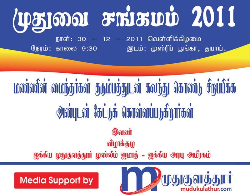 துபாய் : துபாயில் ஐக்கிய முதுகுளத்தூர் முஸ்லிம் ஜமாஅத் சார்பில் முதுவை சங்கமம் 2011 இன்ஷா அல்லாஹ் 30.12.2011 வெள்ளிக்கிழமை காலை 9.30 மணி முதல் மாலை 5 மணி வரை நடைபெற இருக்கிறது.